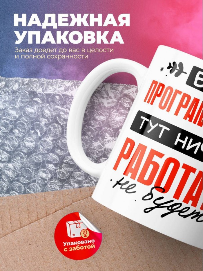 Сувенирная белая кружка с принтом "Без программиста тут ничего работать не будет" – отличный подарок родным и близким людям для любого случая. Уникальный дизайн делает ее неповторимой и привлекательной для глаз. Принты могут быть разными: от ярких креативных решений, которые идеально подойдут молодежи, до классических элегантных узоров, радующих взгляд людей любого поколения во время чаепития. Рисунок наносится с использованием специализированного оборудования, материалами, прошедшими испытания на пригодность к использованию в быту.