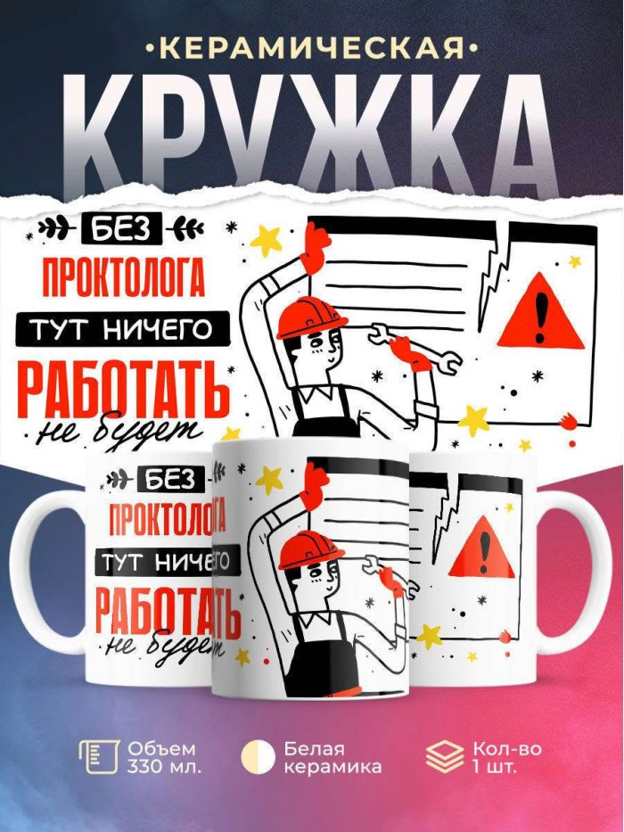 Сувенирная белая кружка с принтом "Без проктолога тут ничего работать не будет" – отличный подарок родным и близким людям для любого случая. Уникальный дизайн делает ее неповторимой и привлекательной для глаз. Принты могут быть разными: от ярких креативных решений, которые идеально подойдут молодежи, до классических элегантных узоров, радующих взгляд людей любого поколения во время чаепития. Рисунок наносится с использованием специализированного оборудования, материалами, прошедшими испытания на пригодность к использованию в быту.