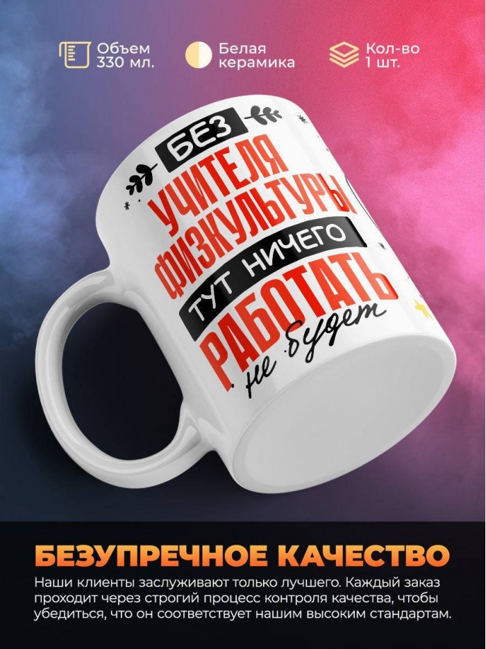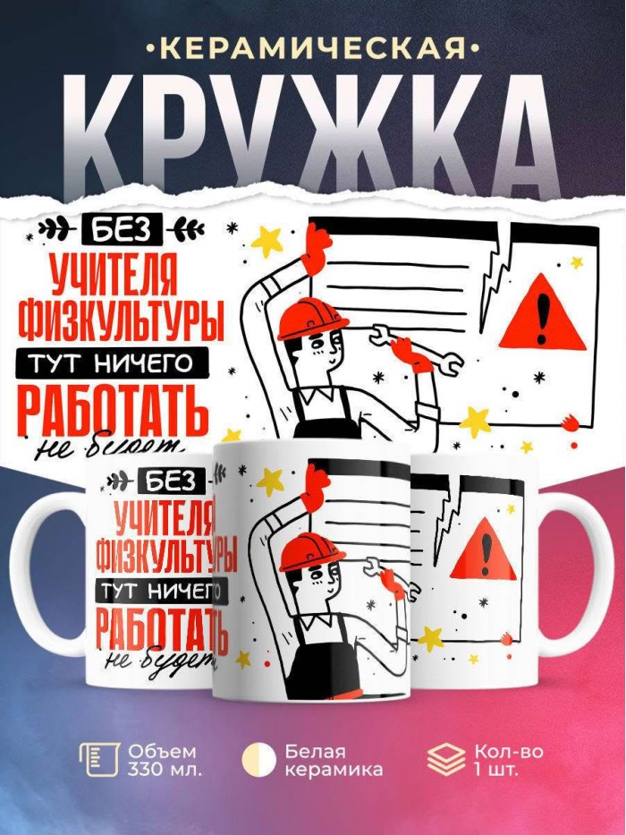 Сувенирная белая кружка с принтом "Без учителя физкультуры тут ничего работать не будет" – отличный подарок родным и близким людям для любого случая. Уникальный дизайн делает ее неповторимой и привлекательной для глаз. Принты могут быть разными: от ярких креативных решений, которые идеально подойдут молодежи, до классических элегантных узоров, радующих взгляд людей любого поколения во время чаепития. Рисунок наносится с использованием специализированного оборудования, материалами, прошедшими испытания на пригодность к использованию в быту.