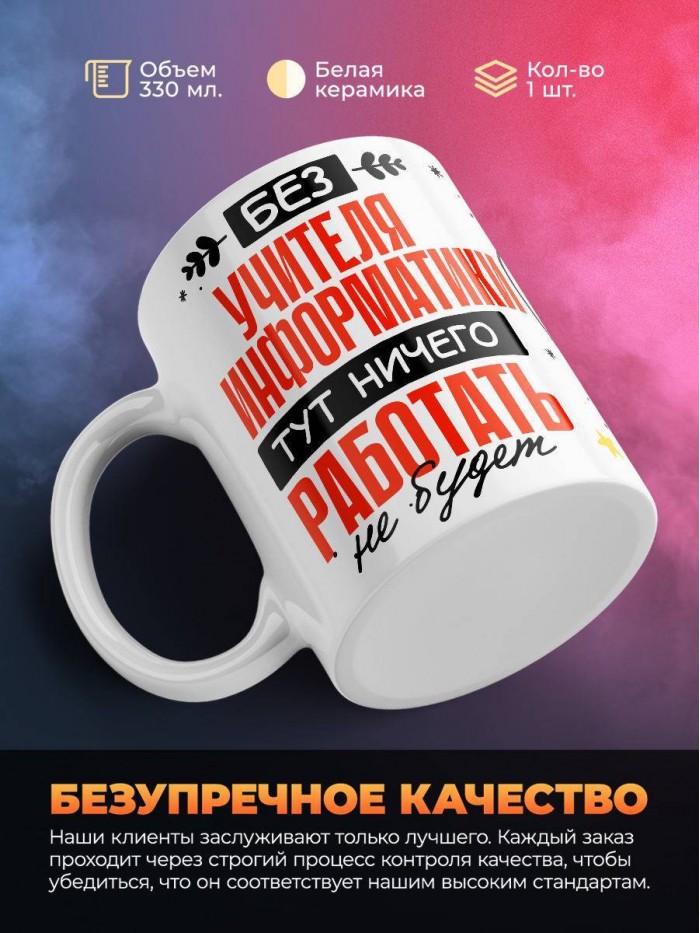 Сувенирная белая кружка с принтом "Без учителя информатики тут ничего работать не будет" – отличный подарок родным и близким людям для любого случая. Уникальный дизайн делает ее неповторимой и привлекательной для глаз. Принты могут быть разными: от ярких креативных решений, которые идеально подойдут молодежи, до классических элегантных узоров, радующих взгляд людей любого поколения во время чаепития. Рисунок наносится с использованием специализированного оборудования, материалами, прошедшими испытания на пригодность к использованию в быту.