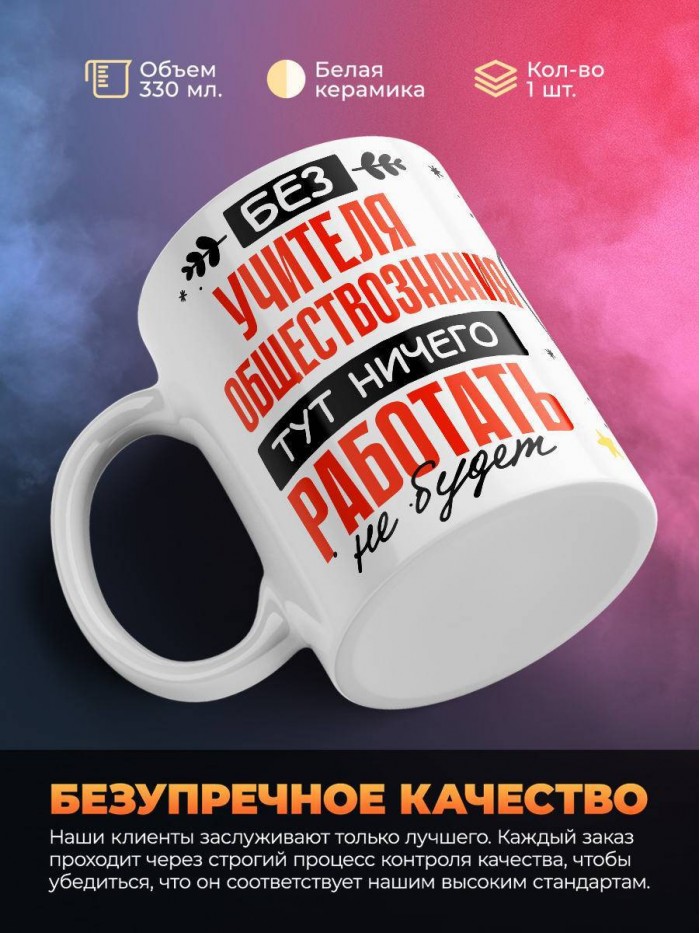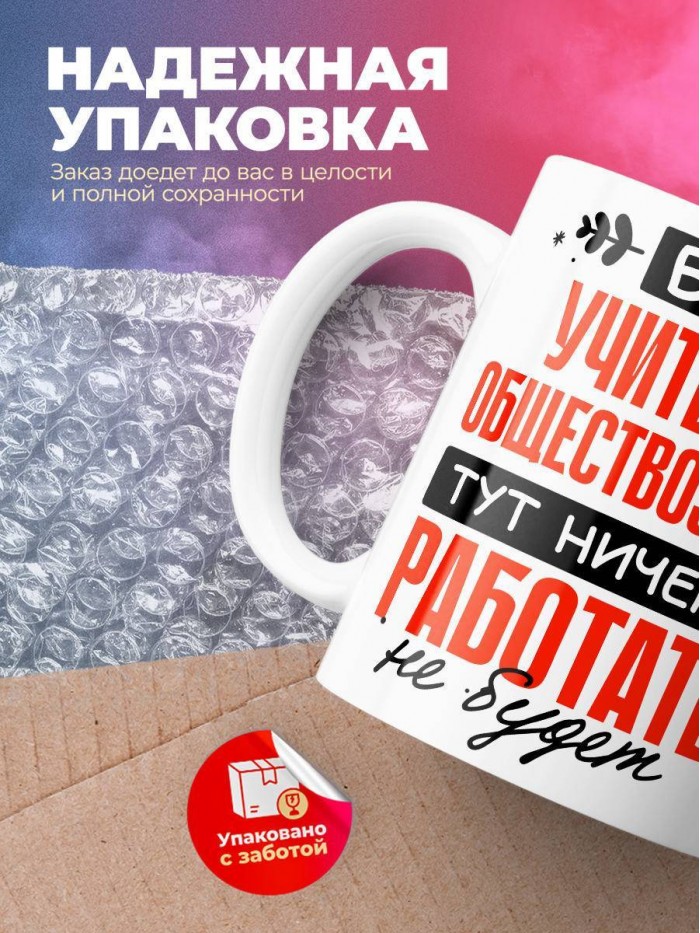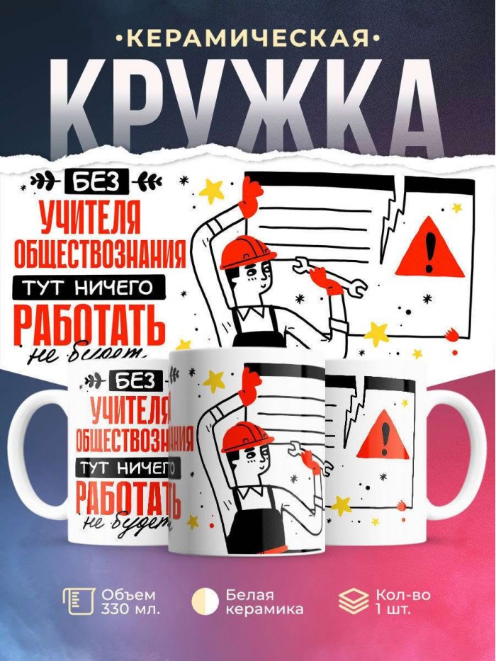 Сувенирная белая кружка с принтом "Без учителя обществознания тут ничего работать не будет" – отличный подарок родным и близким людям для любого случая. Уникальный дизайн делает ее неповторимой и привлекательной для глаз. Принты могут быть разными: от ярких креативных решений, которые идеально подойдут молодежи, до классических элегантных узоров, радующих взгляд людей любого поколения во время чаепития. Рисунок наносится с использованием специализированного оборудования, материалами, прошедшими испытания на пригодность к использованию в быту.