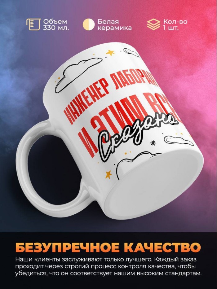 Сувенирная белая кружка с принтом "Инженер лаборант и этим все сказано" – отличный подарок родным и близким людям для любого случая. Уникальный дизайн делает ее неповторимой и привлекательной для глаз. Принты могут быть разными: от ярких креативных решений, которые идеально подойдут молодежи, до классических элегантных узоров, радующих взгляд людей любого поколения во время чаепития. Рисунок наносится с использованием специализированного оборудования, материалами, прошедшими испытания на пригодность к использованию в быту.