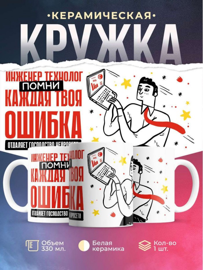 Сувенирная белая кружка с принтом "Инженер технолог помни каждая твоя ошибка отделяет господство нейросети" – отличный подарок родным и близким людям для любого случая. Уникальный дизайн делает ее неповторимой и привлекательной для глаз. Принты могут быть разными: от ярких креативных решений, которые идеально подойдут молодежи, до классических элегантных узоров, радующих взгляд людей любого поколения во время чаепития. Рисунок наносится с использованием специализированного оборудования, материалами, прошедшими испытания на пригодность к использованию в быту.