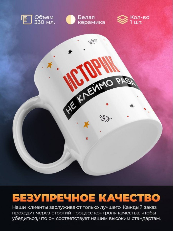 Сувенирная белая кружка с принтом "Историк не клеймо раба, а запись в трудовой книжке" – отличный подарок родным и близким людям для любого случая. Уникальный дизайн делает ее неповторимой и привлекательной для глаз. Принты могут быть разными: от ярких креативных решений, которые идеально подойдут молодежи, до классических элегантных узоров, радующих взгляд людей любого поколения во время чаепития. Рисунок наносится с использованием специализированного оборудования, материалами, прошедшими испытания на пригодность к использованию в быту.