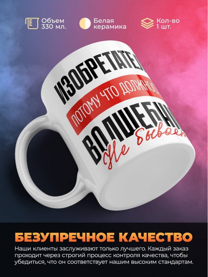Сувенирная белая кружка с принтом "Изобретатель, потому что должности волшебник не бывает" – отличный подарок родным и близким людям для любого случая. Уникальный дизайн делает ее неповторимой и привлекательной для глаз. Принты могут быть разными: от ярких креативных решений, которые идеально подойдут молодежи, до классических элегантных узоров, радующих взгляд людей любого поколения во время чаепития. Рисунок наносится с использованием специализированного оборудования, материалами, прошедшими испытания на пригодность к использованию в быту.