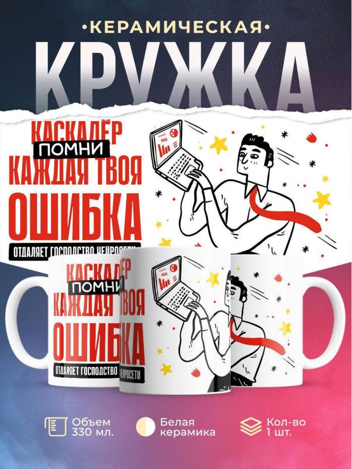 Сувенирная белая кружка с принтом "Каскадёр помни каждая твоя ошибка отделяет господство нейросети" – отличный подарок родным и близким людям для любого случая. Уникальный дизайн делает ее неповторимой и привлекательной для глаз. Принты могут быть разными: от ярких креативных решений, которые идеально подойдут молодежи, до классических элегантных узоров, радующих взгляд людей любого поколения во время чаепития. Рисунок наносится с использованием специализированного оборудования, материалами, прошедшими испытания на пригодность к использованию в быту.