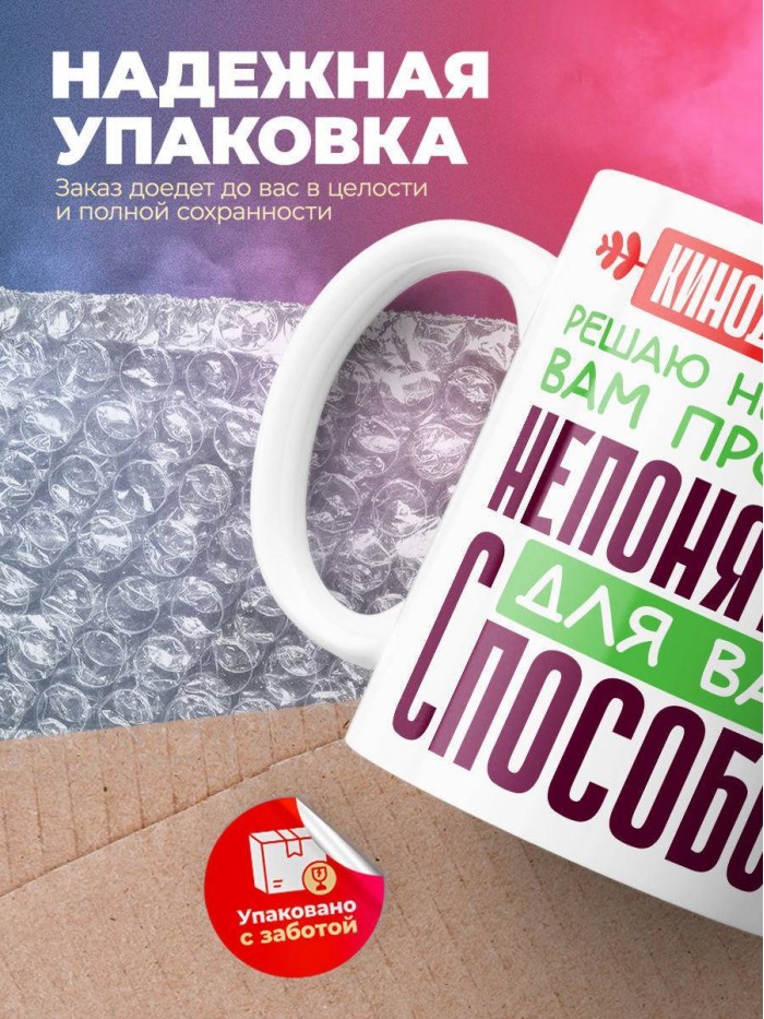 Сувенирная белая кружка с принтом "Кинодраматург решаю неизвестные вам проблемы непонятным для вас способом" – отличный подарок родным и близким людям для любого случая. Уникальный дизайн делает ее неповторимой и привлекательной для глаз. Принты могут быть разными: от ярких креативных решений, которые идеально подойдут молодежи, до классических элегантных узоров, радующих взгляд людей любого поколения во время чаепития. Рисунок наносится с использованием специализированного оборудования, материалами, прошедшими испытания на пригодность к использованию в быту.