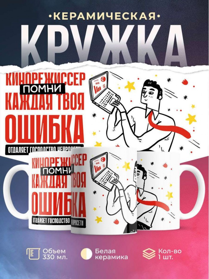 Сувенирная белая кружка с принтом "Кинорежиссер помни каждая твоя ошибка отделяет господство нейросети" – отличный подарок родным и близким людям для любого случая. Уникальный дизайн делает ее неповторимой и привлекательной для глаз. Принты могут быть разными: от ярких креативных решений, которые идеально подойдут молодежи, до классических элегантных узоров, радующих взгляд людей любого поколения во время чаепития. Рисунок наносится с использованием специализированного оборудования, материалами, прошедшими испытания на пригодность к использованию в быту.