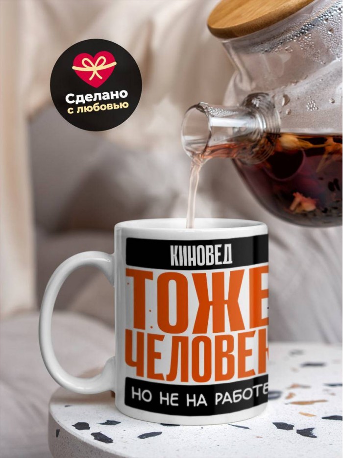 Сувенирная белая кружка с принтом "Киновед тоже человек, но не на работе" – отличный подарок родным и близким людям для любого случая. Уникальный дизайн делает ее неповторимой и привлекательной для глаз. Принты могут быть разными: от ярких креативных решений, которые идеально подойдут молодежи, до классических элегантных узоров, радующих взгляд людей любого поколения во время чаепития. Рисунок наносится с использованием специализированного оборудования, материалами, прошедшими испытания на пригодность к использованию в быту.