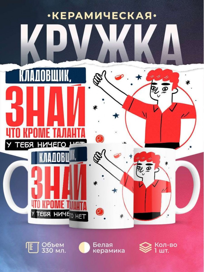 Сувенирная белая кружка с принтом "Кладовщик, знай, что кроме таланта у тебя ничего нет" – отличный подарок родным и близким людям для любого случая. Уникальный дизайн делает ее неповторимой и привлекательной для глаз. Принты могут быть разными: от ярких креативных решений, которые идеально подойдут молодежи, до классических элегантных узоров, радующих взгляд людей любого поколения во время чаепития. Рисунок наносится с использованием специализированного оборудования, материалами, прошедшими испытания на пригодность к использованию в быту.