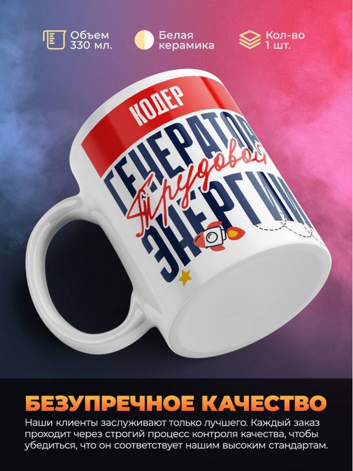 Сувенирная белая кружка с принтом "Кодер генератор трудовой энергии" – отличный подарок родным и близким людям для любого случая. Уникальный дизайн делает ее неповторимой и привлекательной для глаз. Принты могут быть разными: от ярких креативных решений, которые идеально подойдут молодежи, до классических элегантных узоров, радующих взгляд людей любого поколения во время чаепития. Рисунок наносится с использованием специализированного оборудования, материалами, прошедшими испытания на пригодность к использованию в быту.