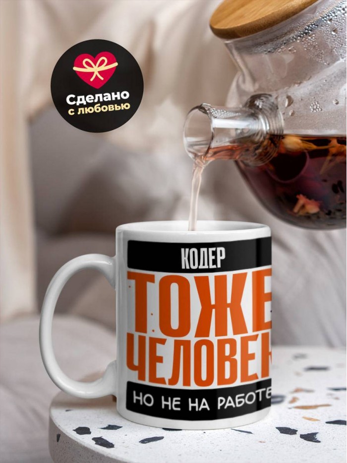 Сувенирная белая кружка с принтом "Кодер тоже человек, но не на работе" – отличный подарок родным и близким людям для любого случая. Уникальный дизайн делает ее неповторимой и привлекательной для глаз. Принты могут быть разными: от ярких креативных решений, которые идеально подойдут молодежи, до классических элегантных узоров, радующих взгляд людей любого поколения во время чаепития. Рисунок наносится с использованием специализированного оборудования, материалами, прошедшими испытания на пригодность к использованию в быту.