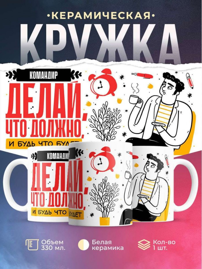 Сувенирная белая кружка с принтом "Командир делай что должно и будь что будет" – отличный подарок родным и близким людям для любого случая. Уникальный дизайн делает ее неповторимой и привлекательной для глаз. Принты могут быть разными: от ярких креативных решений, которые идеально подойдут молодежи, до классических элегантных узоров, радующих взгляд людей любого поколения во время чаепития. Рисунок наносится с использованием специализированного оборудования, материалами, прошедшими испытания на пригодность к использованию в быту.