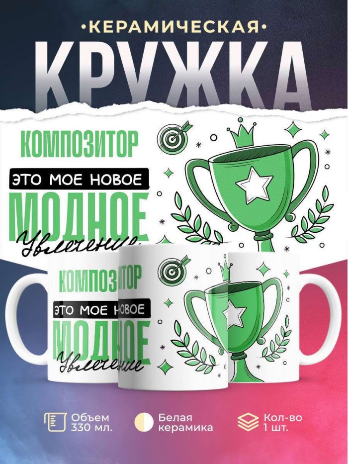 Сувенирная белая кружка с принтом "Композитор это мое новое модное увлечение" – отличный подарок родным и близким людям для любого случая. Уникальный дизайн делает ее неповторимой и привлекательной для глаз. Принты могут быть разными: от ярких креативных решений, которые идеально подойдут молодежи, до классических элегантных узоров, радующих взгляд людей любого поколения во время чаепития. Рисунок наносится с использованием специализированного оборудования, материалами, прошедшими испытания на пригодность к использованию в быту.