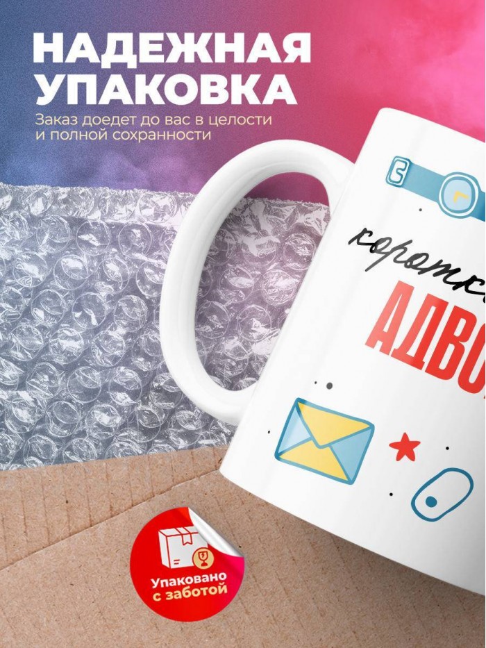 Сувенирная белая кружка с принтом "Коротко о себе адвокат" – отличный подарок родным и близким людям для любого случая. Уникальный дизайн делает ее неповторимой и привлекательной для глаз. Принты могут быть разными: от ярких креативных решений, которые идеально подойдут молодежи, до классических элегантных узоров, радующих взгляд людей любого поколения во время чаепития. Рисунок наносится с использованием специализированного оборудования, материалами, прошедшими испытания на пригодность к использованию в быту.