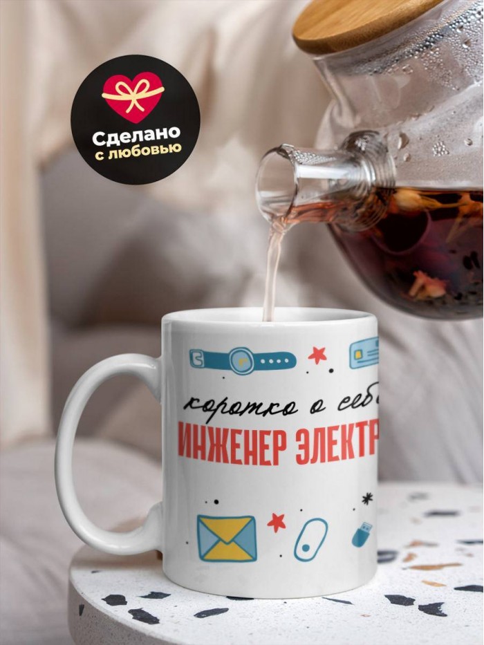 Сувенирная белая кружка с принтом "Коротко о себе инженер электрик" – отличный подарок родным и близким людям для любого случая. Уникальный дизайн делает ее неповторимой и привлекательной для глаз. Принты могут быть разными: от ярких креативных решений, которые идеально подойдут молодежи, до классических элегантных узоров, радующих взгляд людей любого поколения во время чаепития. Рисунок наносится с использованием специализированного оборудования, материалами, прошедшими испытания на пригодность к использованию в быту.