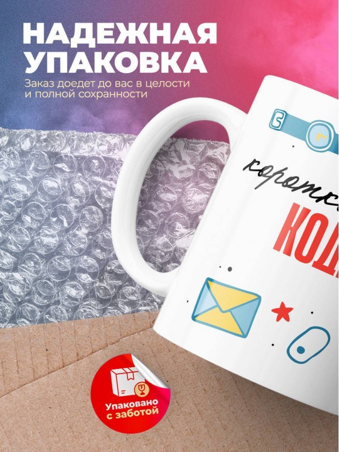 Сувенирная белая кружка с принтом "Коротко о себе кодер" – отличный подарок родным и близким людям для любого случая. Уникальный дизайн делает ее неповторимой и привлекательной для глаз. Принты могут быть разными: от ярких креативных решений, которые идеально подойдут молодежи, до классических элегантных узоров, радующих взгляд людей любого поколения во время чаепития. Рисунок наносится с использованием специализированного оборудования, материалами, прошедшими испытания на пригодность к использованию в быту.