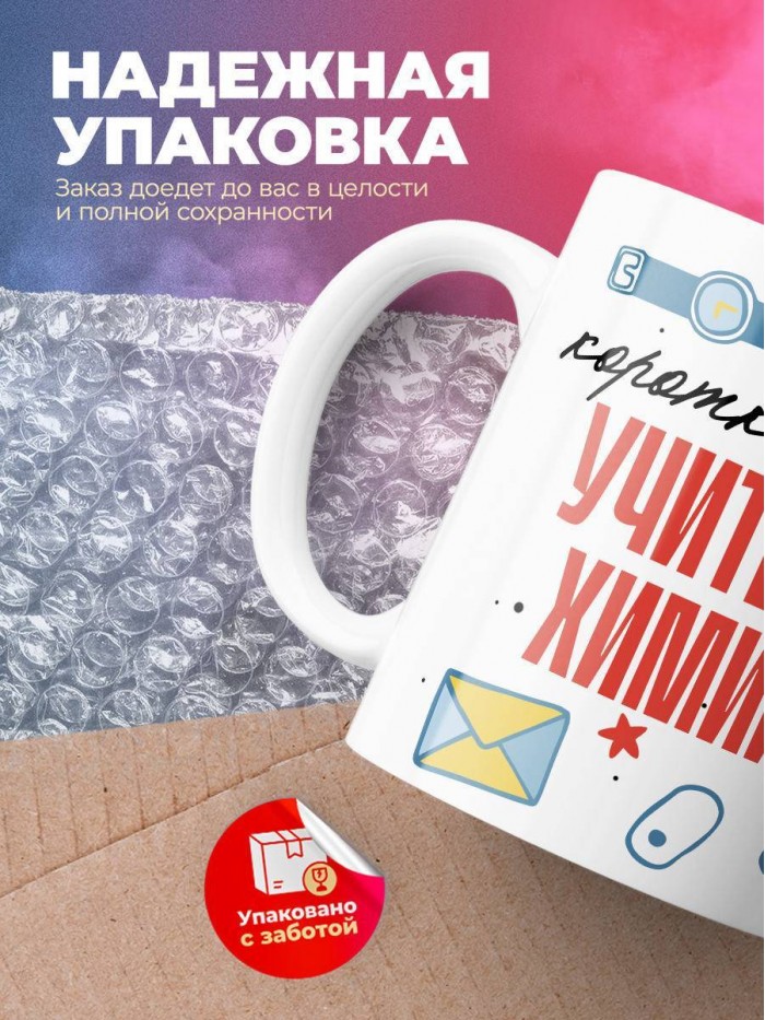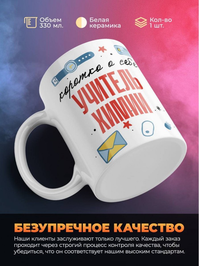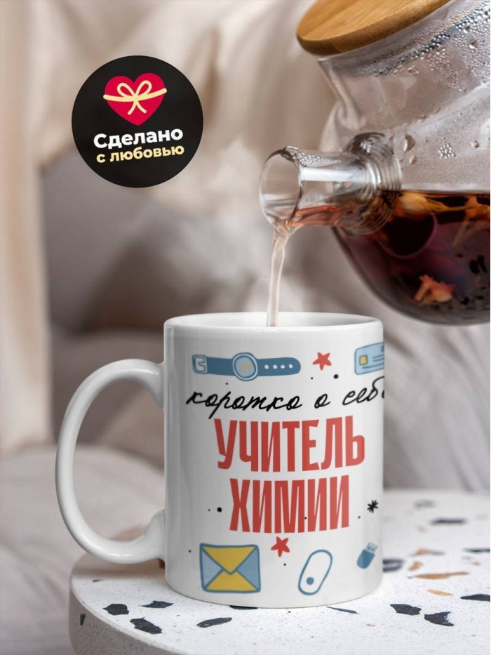 Сувенирная белая кружка с принтом "Коротко о себе учитель химии" – отличный подарок родным и близким людям для любого случая. Уникальный дизайн делает ее неповторимой и привлекательной для глаз. Принты могут быть разными: от ярких креативных решений, которые идеально подойдут молодежи, до классических элегантных узоров, радующих взгляд людей любого поколения во время чаепития. Рисунок наносится с использованием специализированного оборудования, материалами, прошедшими испытания на пригодность к использованию в быту.