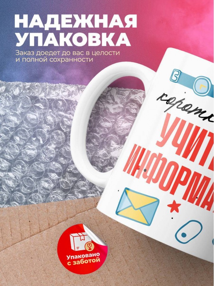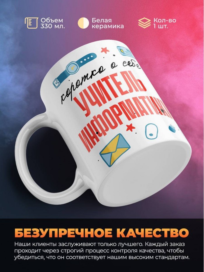 Сувенирная белая кружка с принтом "Коротко о себе учитель информатики" – отличный подарок родным и близким людям для любого случая. Уникальный дизайн делает ее неповторимой и привлекательной для глаз. Принты могут быть разными: от ярких креативных решений, которые идеально подойдут молодежи, до классических элегантных узоров, радующих взгляд людей любого поколения во время чаепития. Рисунок наносится с использованием специализированного оборудования, материалами, прошедшими испытания на пригодность к использованию в быту.