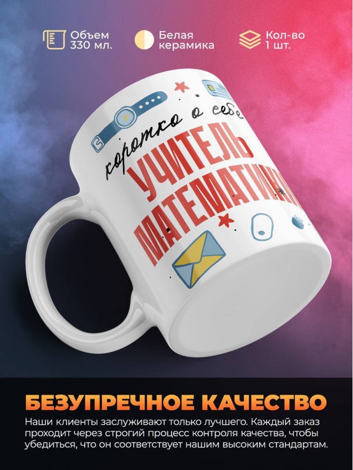 Сувенирная белая кружка с принтом "Коротко о себе учитель математики" – отличный подарок родным и близким людям для любого случая. Уникальный дизайн делает ее неповторимой и привлекательной для глаз. Принты могут быть разными: от ярких креативных решений, которые идеально подойдут молодежи, до классических элегантных узоров, радующих взгляд людей любого поколения во время чаепития. Рисунок наносится с использованием специализированного оборудования, материалами, прошедшими испытания на пригодность к использованию в быту.