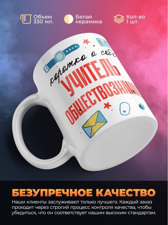 Сувенирная белая кружка с принтом "Коротко о себе учитель обществознания" – отличный подарок родным и близким людям для любого случая. Уникальный дизайн делает ее неповторимой и привлекательной для глаз. Принты могут быть разными: от ярких креативных решений, которые идеально подойдут молодежи, до классических элегантных узоров, радующих взгляд людей любого поколения во время чаепития. Рисунок наносится с использованием специализированного оборудования, материалами, прошедшими испытания на пригодность к использованию в быту.