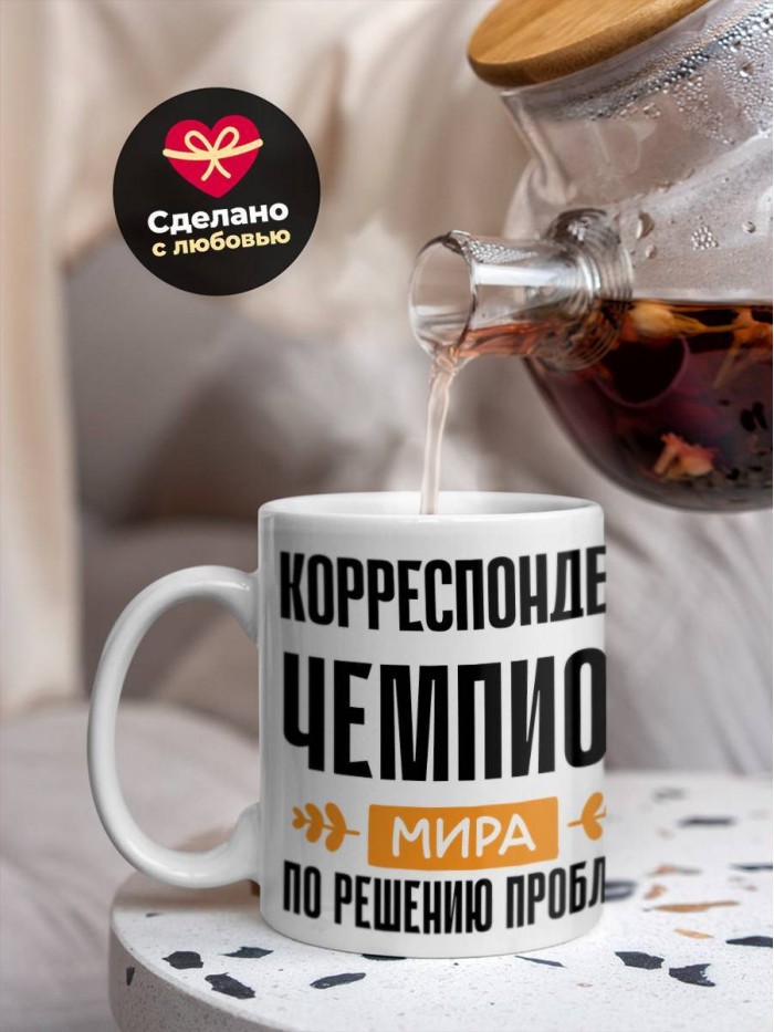 Сувенирная белая кружка с принтом "Корреспондент чемпион мира по решению проблем" – отличный подарок родным и близким людям для любого случая. Уникальный дизайн делает ее неповторимой и привлекательной для глаз. Принты могут быть разными: от ярких креативных решений, которые идеально подойдут молодежи, до классических элегантных узоров, радующих взгляд людей любого поколения во время чаепития. Рисунок наносится с использованием специализированного оборудования, материалами, прошедшими испытания на пригодность к использованию в быту.