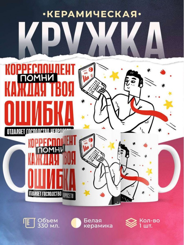 Сувенирная белая кружка с принтом "Корреспондент помни каждая твоя ошибка отделяет господство нейросети" – отличный подарок родным и близким людям для любого случая. Уникальный дизайн делает ее неповторимой и привлекательной для глаз. Принты могут быть разными: от ярких креативных решений, которые идеально подойдут молодежи, до классических элегантных узоров, радующих взгляд людей любого поколения во время чаепития. Рисунок наносится с использованием специализированного оборудования, материалами, прошедшими испытания на пригодность к использованию в быту.