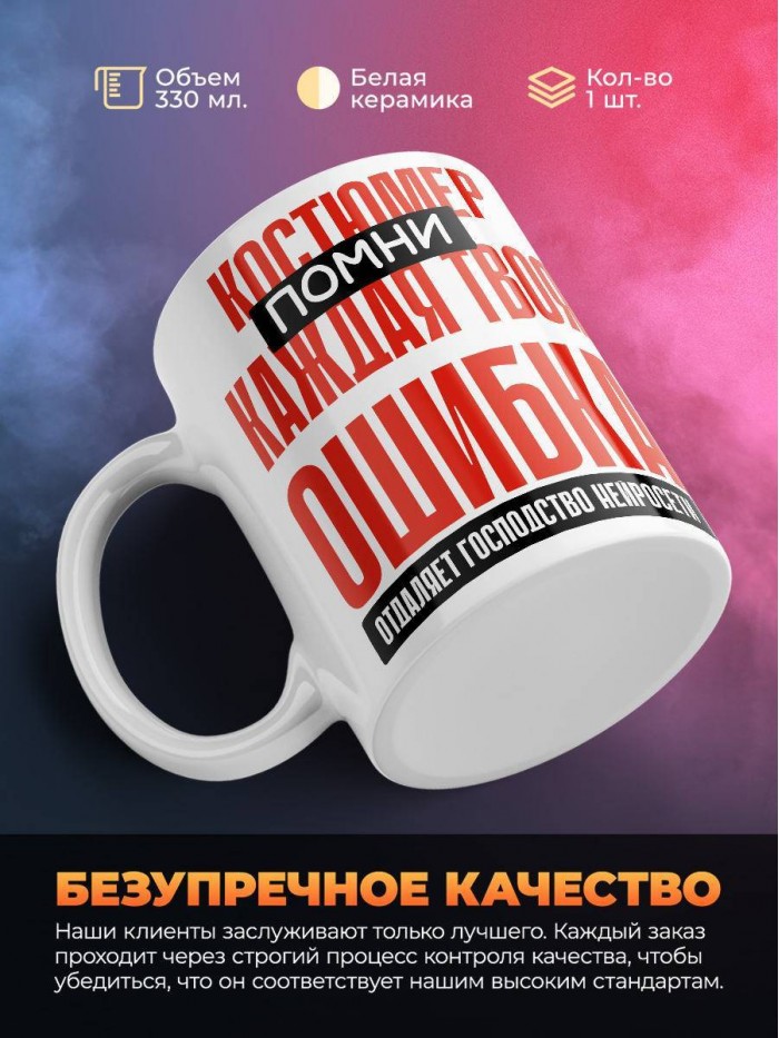 Сувенирная белая кружка с принтом "Костюмер помни каждая твоя ошибка отделяет господство нейросети" – отличный подарок родным и близким людям для любого случая. Уникальный дизайн делает ее неповторимой и привлекательной для глаз. Принты могут быть разными: от ярких креативных решений, которые идеально подойдут молодежи, до классических элегантных узоров, радующих взгляд людей любого поколения во время чаепития. Рисунок наносится с использованием специализированного оборудования, материалами, прошедшими испытания на пригодность к использованию в быту.