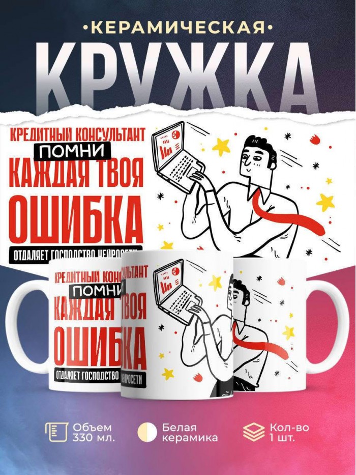 Сувенирная белая кружка с принтом "Кредитный консультант помни каждая твоя ошибка отделяет господство нейросети" – отличный подарок родным и близким людям для любого случая. Уникальный дизайн делает ее неповторимой и привлекательной для глаз. Принты могут быть разными: от ярких креативных решений, которые идеально подойдут молодежи, до классических элегантных узоров, радующих взгляд людей любого поколения во время чаепития. Рисунок наносится с использованием специализированного оборудования, материалами, прошедшими испытания на пригодность к использованию в быту.