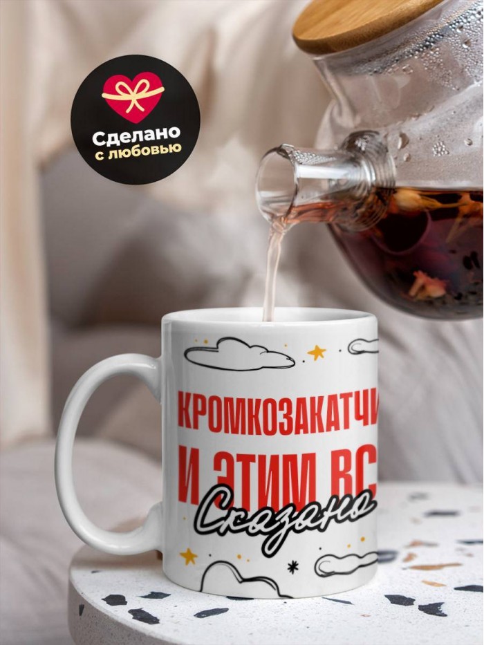 Сувенирная белая кружка с принтом "Кромкозакатчик и этим все сказано" – отличный подарок родным и близким людям для любого случая. Уникальный дизайн делает ее неповторимой и привлекательной для глаз. Принты могут быть разными: от ярких креативных решений, которые идеально подойдут молодежи, до классических элегантных узоров, радующих взгляд людей любого поколения во время чаепития. Рисунок наносится с использованием специализированного оборудования, материалами, прошедшими испытания на пригодность к использованию в быту.