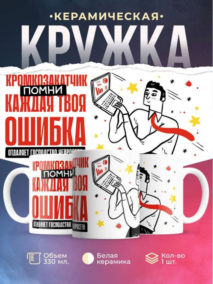 Сувенирная белая кружка с принтом "Кромкозакатчик помни каждая твоя ошибка отделяет господство нейросети" – отличный подарок родным и близким людям для любого случая. Уникальный дизайн делает ее неповторимой и привлекательной для глаз. Принты могут быть разными: от ярких креативных решений, которые идеально подойдут молодежи, до классических элегантных узоров, радующих взгляд людей любого поколения во время чаепития. Рисунок наносится с использованием специализированного оборудования, материалами, прошедшими испытания на пригодность к использованию в быту.