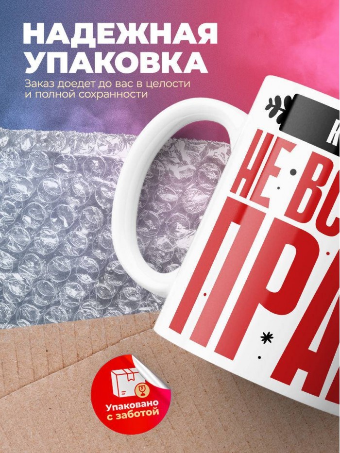 Кружка изготовлена из качественной керамики. Это обеспечивает долгий срок службы продукта. Прочный материал кружки выдерживает физические воздействия. Ее легко можно брать с собой в путешествие, без страха возникновения повреждений. Она удобна в использовании и легко моется. Покрытие кружки выдерживает мытье с применением бытовой химии любого типа. Белый цвет бокала идеально сочетается с принтами. Это делает ее универсальным подарком к празднику для людей всех возрастов и полов. При заказе можно выбрать вариант, который больше подойдет для определенного клиента.