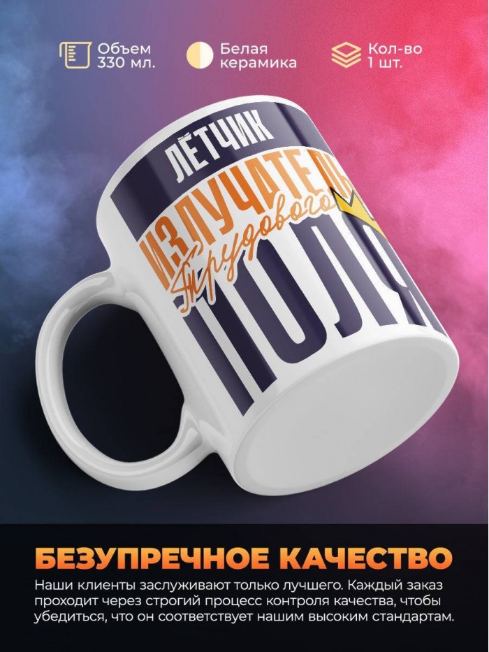 Сувенирная белая кружка с принтом "Лётчик излучатель трудового поля" – отличный подарок родным и близким людям для любого случая. Уникальный дизайн делает ее неповторимой и привлекательной для глаз. Принты могут быть разными: от ярких креативных решений, которые идеально подойдут молодежи, до классических элегантных узоров, радующих взгляд людей любого поколения во время чаепития. Рисунок наносится с использованием специализированного оборудования, материалами, прошедшими испытания на пригодность к использованию в быту.