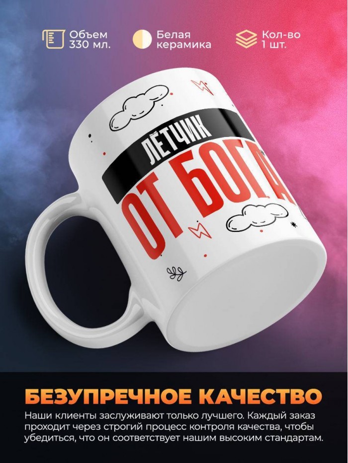 Сувенирная белая кружка с принтом "Лётчик от бога" – отличный подарок родным и близким людям для любого случая. Уникальный дизайн делает ее неповторимой и привлекательной для глаз. Принты могут быть разными: от ярких креативных решений, которые идеально подойдут молодежи, до классических элегантных узоров, радующих взгляд людей любого поколения во время чаепития. Рисунок наносится с использованием специализированного оборудования, материалами, прошедшими испытания на пригодность к использованию в быту.