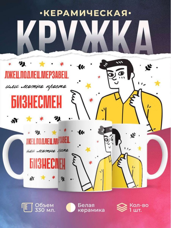 Сувенирная белая кружка с принтом "Лжец подлец мерзавец или можно просто бизнесмен" – отличный подарок родным и близким людям для любого случая. Уникальный дизайн делает ее неповторимой и привлекательной для глаз. Принты могут быть разными: от ярких креативных решений, которые идеально подойдут молодежи, до классических элегантных узоров, радующих взгляд людей любого поколения во время чаепития. Рисунок наносится с использованием специализированного оборудования, материалами, прошедшими испытания на пригодность к использованию в быту.