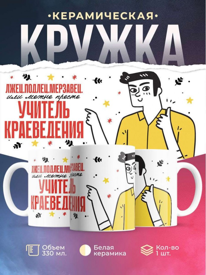 Сувенирная белая кружка с принтом "Лжец, подлец, мерзавец или можно просто учитель краеведения" – отличный подарок родным и близким людям для любого случая. Уникальный дизайн делает ее неповторимой и привлекательной для глаз. Принты могут быть разными: от ярких креативных решений, которые идеально подойдут молодежи, до классических элегантных узоров, радующих взгляд людей любого поколения во время чаепития. Рисунок наносится с использованием специализированного оборудования, материалами, прошедшими испытания на пригодность к использованию в быту.