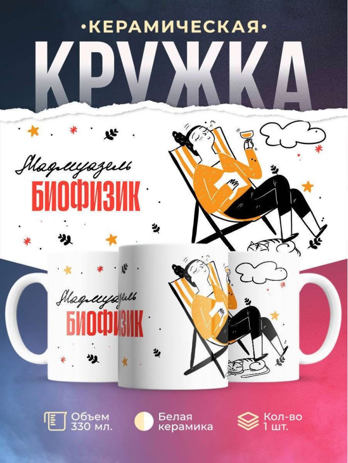 Сувенирная белая кружка с принтом "Мадмуазель биофизик" – отличный подарок родным и близким людям для любого случая. Уникальный дизайн делает ее неповторимой и привлекательной для глаз. Принты могут быть разными: от ярких креативных решений, которые идеально подойдут молодежи, до классических элегантных узоров, радующих взгляд людей любого поколения во время чаепития. Рисунок наносится с использованием специализированного оборудования, материалами, прошедшими испытания на пригодность к использованию в быту.