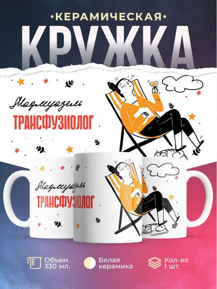 Сувенирная белая кружка с принтом "Мадмуазель трансфузиолог" – отличный подарок родным и близким людям для любого случая. Уникальный дизайн делает ее неповторимой и привлекательной для глаз. Принты могут быть разными: от ярких креативных решений, которые идеально подойдут молодежи, до классических элегантных узоров, радующих взгляд людей любого поколения во время чаепития. Рисунок наносится с использованием специализированного оборудования, материалами, прошедшими испытания на пригодность к использованию в быту.