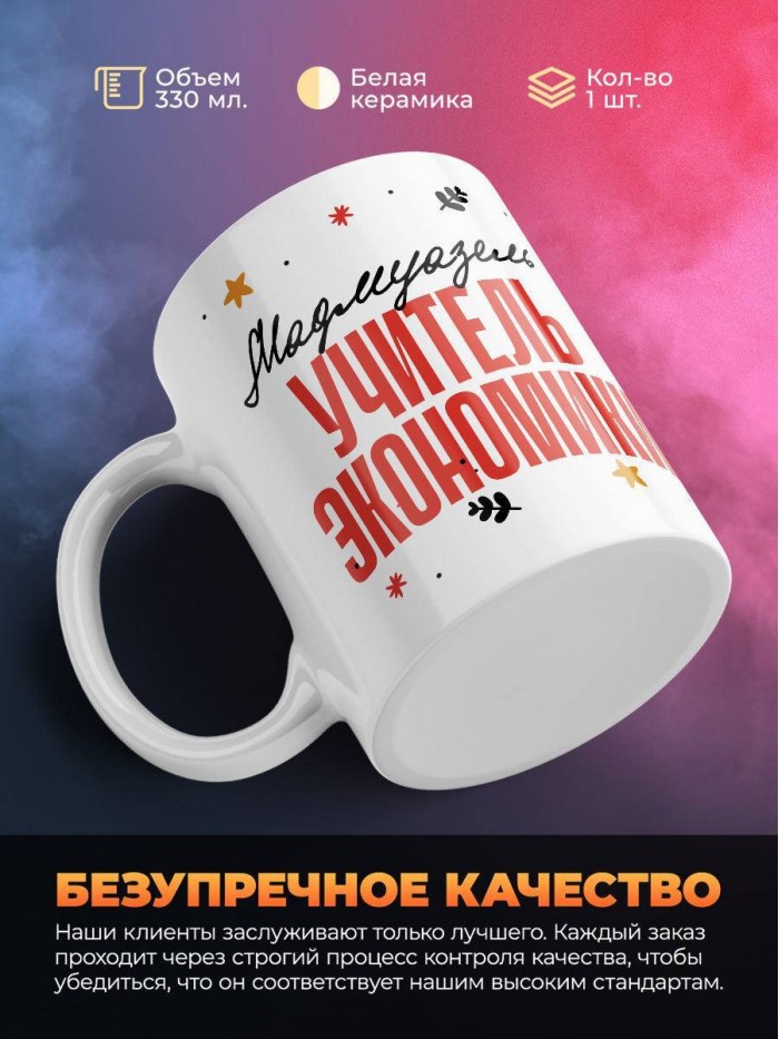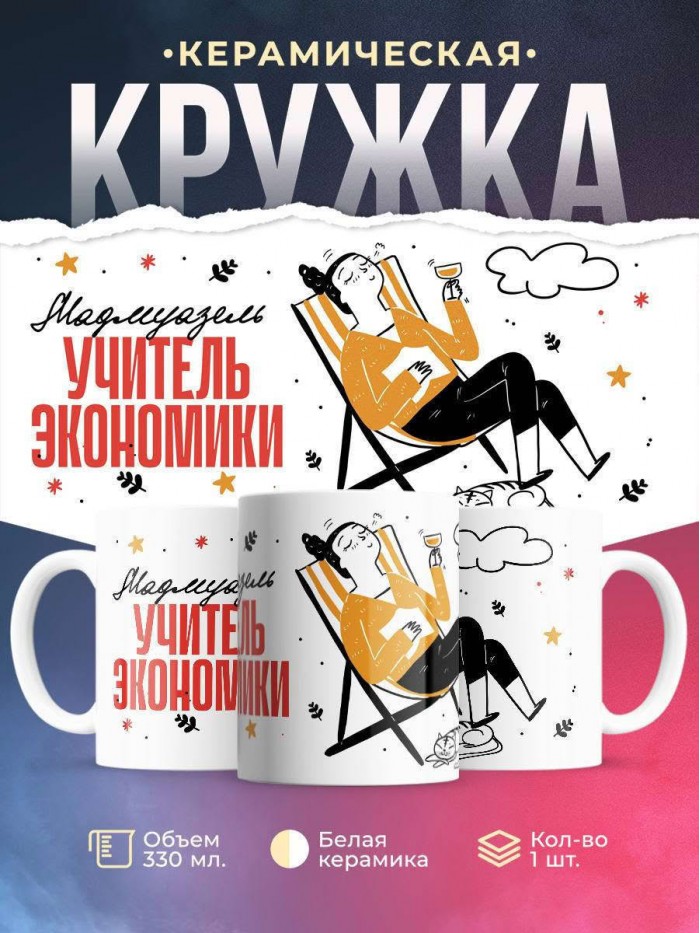 Сувенирная белая кружка с принтом "Мадмуазель учитель экономики" – отличный подарок родным и близким людям для любого случая. Уникальный дизайн делает ее неповторимой и привлекательной для глаз. Принты могут быть разными: от ярких креативных решений, которые идеально подойдут молодежи, до классических элегантных узоров, радующих взгляд людей любого поколения во время чаепития. Рисунок наносится с использованием специализированного оборудования, материалами, прошедшими испытания на пригодность к использованию в быту.