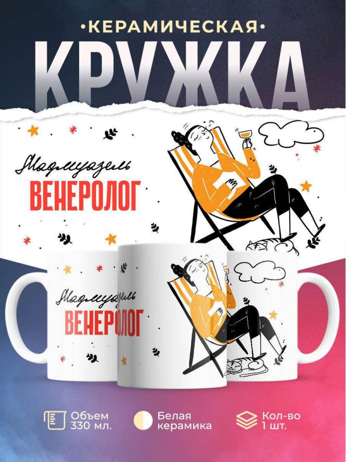 Сувенирная белая кружка с принтом "Мадмуазель венеролог" – отличный подарок родным и близким людям для любого случая. Уникальный дизайн делает ее неповторимой и привлекательной для глаз. Принты могут быть разными: от ярких креативных решений, которые идеально подойдут молодежи, до классических элегантных узоров, радующих взгляд людей любого поколения во время чаепития. Рисунок наносится с использованием специализированного оборудования, материалами, прошедшими испытания на пригодность к использованию в быту.