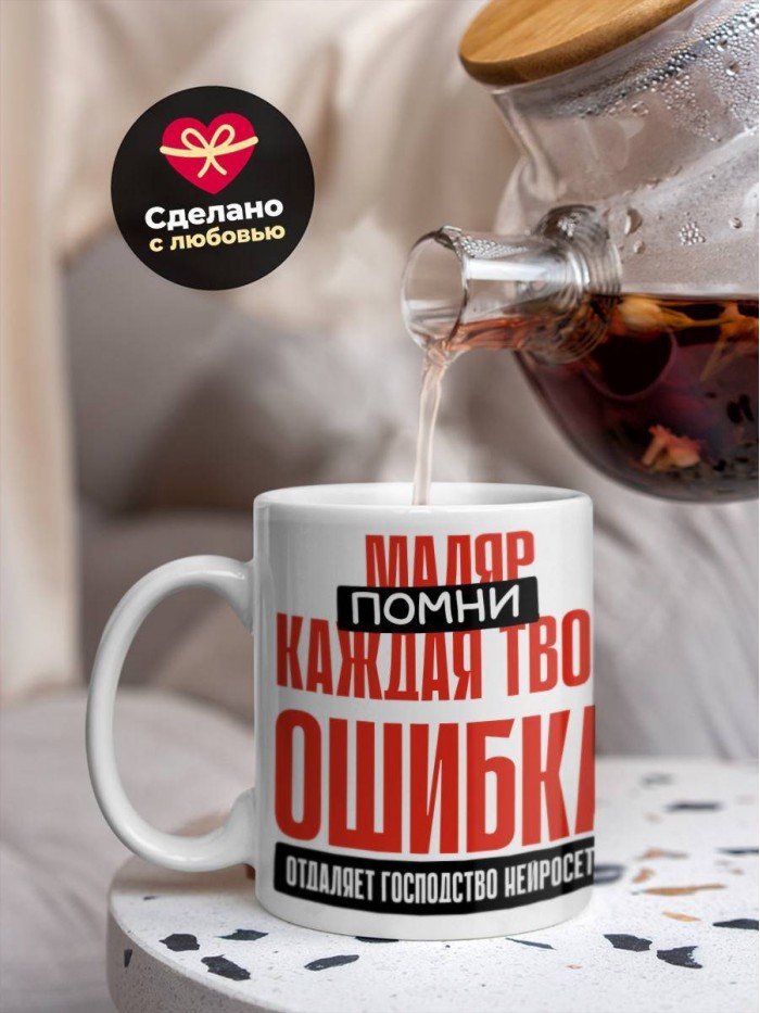 Сувенирная белая кружка с принтом "Маляр помни каждая твоя ошибка отделяет господство нейросети" – отличный подарок родным и близким людям для любого случая. Уникальный дизайн делает ее неповторимой и привлекательной для глаз. Принты могут быть разными: от ярких креативных решений, которые идеально подойдут молодежи, до классических элегантных узоров, радующих взгляд людей любого поколения во время чаепития. Рисунок наносится с использованием специализированного оборудования, материалами, прошедшими испытания на пригодность к использованию в быту.