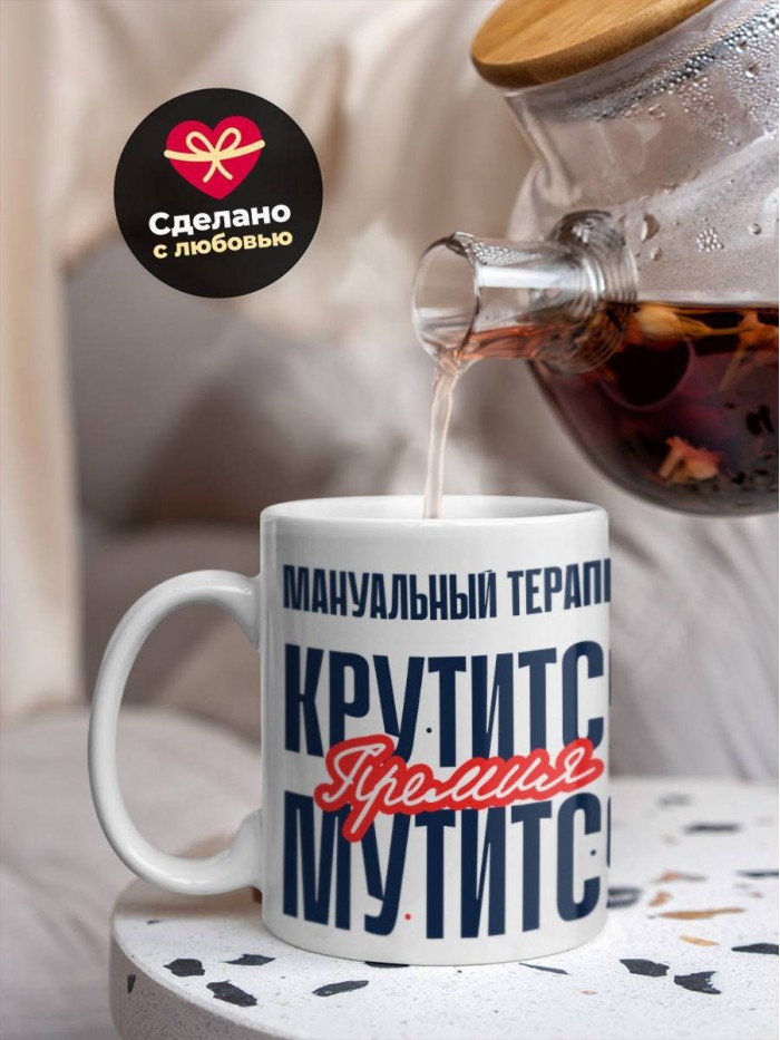 Сувенирная белая кружка с принтом "Мануальный терапевт крутится премия мутится" – отличный подарок родным и близким людям для любого случая. Уникальный дизайн делает ее неповторимой и привлекательной для глаз. Принты могут быть разными: от ярких креативных решений, которые идеально подойдут молодежи, до классических элегантных узоров, радующих взгляд людей любого поколения во время чаепития. Рисунок наносится с использованием специализированного оборудования, материалами, прошедшими испытания на пригодность к использованию в быту.