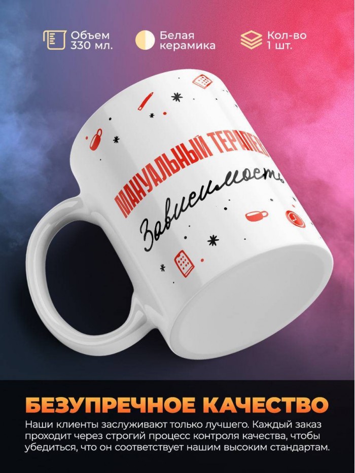 Сувенирная белая кружка с принтом "Мануальный терапевт зависимость" – отличный подарок родным и близким людям для любого случая. Уникальный дизайн делает ее неповторимой и привлекательной для глаз. Принты могут быть разными: от ярких креативных решений, которые идеально подойдут молодежи, до классических элегантных узоров, радующих взгляд людей любого поколения во время чаепития. Рисунок наносится с использованием специализированного оборудования, материалами, прошедшими испытания на пригодность к использованию в быту.