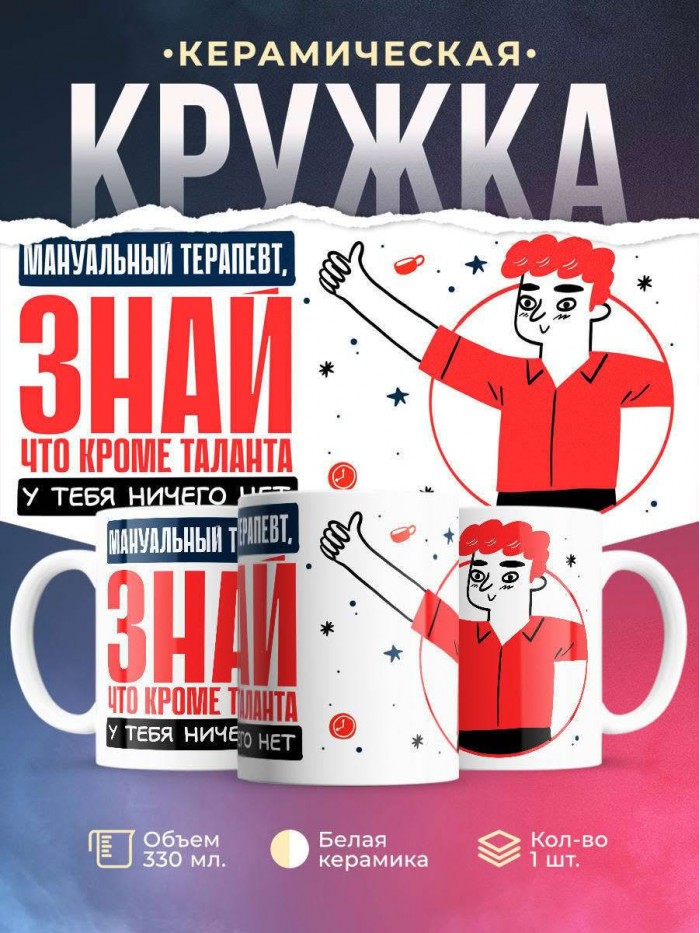 Сувенирная белая кружка с принтом "Мануальный терапевт, знай, что кроме таланта у тебя ничего нет" – отличный подарок родным и близким людям для любого случая. Уникальный дизайн делает ее неповторимой и привлекательной для глаз. Принты могут быть разными: от ярких креативных решений, которые идеально подойдут молодежи, до классических элегантных узоров, радующих взгляд людей любого поколения во время чаепития. Рисунок наносится с использованием специализированного оборудования, материалами, прошедшими испытания на пригодность к использованию в быту.