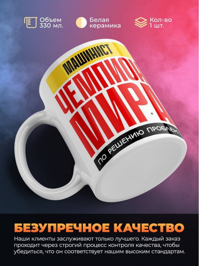 Сувенирная белая кружка с принтом "Машинист чемпион мира по решению проблем" – отличный подарок родным и близким людям для любого случая. Уникальный дизайн делает ее неповторимой и привлекательной для глаз. Принты могут быть разными: от ярких креативных решений, которые идеально подойдут молодежи, до классических элегантных узоров, радующих взгляд людей любого поколения во время чаепития. Рисунок наносится с использованием специализированного оборудования, материалами, прошедшими испытания на пригодность к использованию в быту.