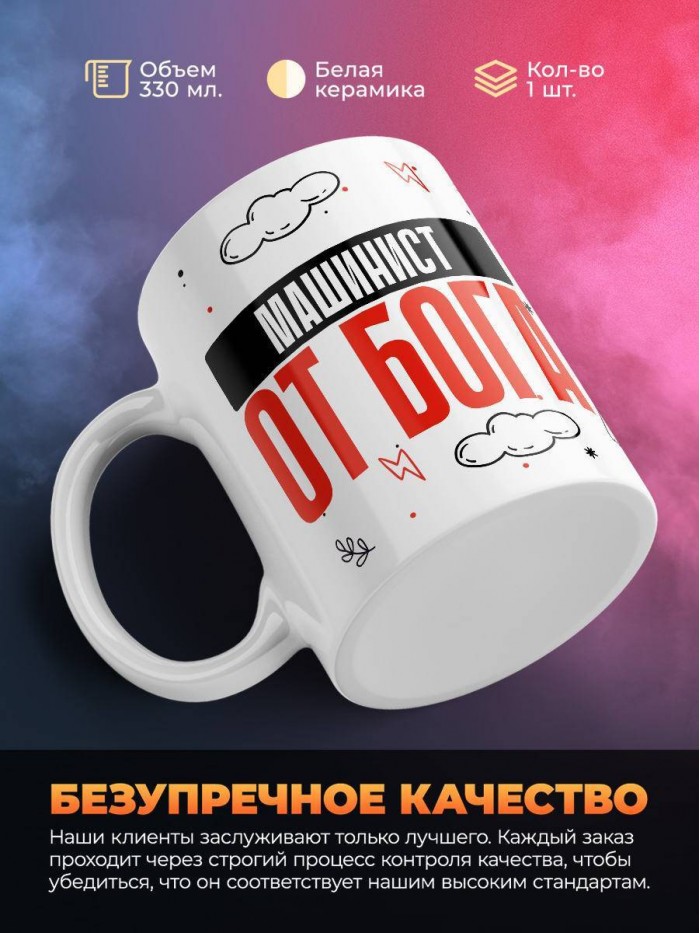 Сувенирная белая кружка с принтом "Машинист от бога" – отличный подарок родным и близким людям для любого случая. Уникальный дизайн делает ее неповторимой и привлекательной для глаз. Принты могут быть разными: от ярких креативных решений, которые идеально подойдут молодежи, до классических элегантных узоров, радующих взгляд людей любого поколения во время чаепития. Рисунок наносится с использованием специализированного оборудования, материалами, прошедшими испытания на пригодность к использованию в быту.