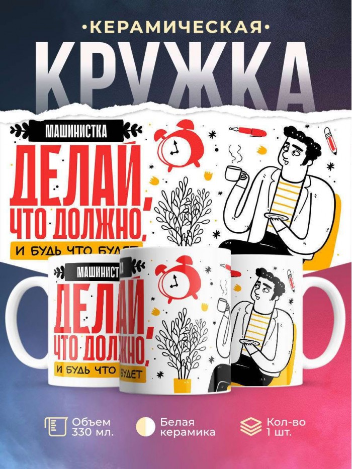 Сувенирная белая кружка с принтом "Машинистка делай что должно и будь что будет" – отличный подарок родным и близким людям для любого случая. Уникальный дизайн делает ее неповторимой и привлекательной для глаз. Принты могут быть разными: от ярких креативных решений, которые идеально подойдут молодежи, до классических элегантных узоров, радующих взгляд людей любого поколения во время чаепития. Рисунок наносится с использованием специализированного оборудования, материалами, прошедшими испытания на пригодность к использованию в быту.