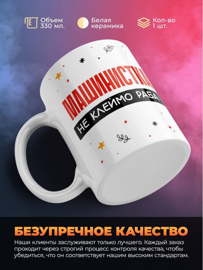 Сувенирная белая кружка с принтом "Машинистка не клеймо раба, а запись в трудовой книжке" – отличный подарок родным и близким людям для любого случая. Уникальный дизайн делает ее неповторимой и привлекательной для глаз. Принты могут быть разными: от ярких креативных решений, которые идеально подойдут молодежи, до классических элегантных узоров, радующих взгляд людей любого поколения во время чаепития. Рисунок наносится с использованием специализированного оборудования, материалами, прошедшими испытания на пригодность к использованию в быту.