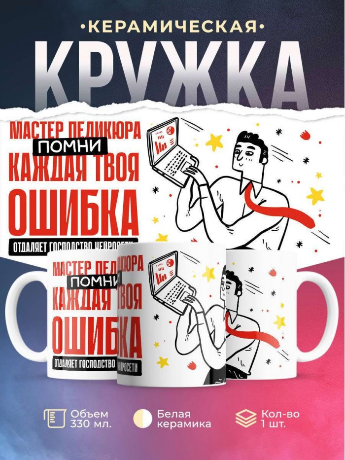 Сувенирная белая кружка с принтом "Мастер педикюра помни каждая твоя ошибка отделяет господство нейросети" – отличный подарок родным и близким людям для любого случая. Уникальный дизайн делает ее неповторимой и привлекательной для глаз. Принты могут быть разными: от ярких креативных решений, которые идеально подойдут молодежи, до классических элегантных узоров, радующих взгляд людей любого поколения во время чаепития. Рисунок наносится с использованием специализированного оборудования, материалами, прошедшими испытания на пригодность к использованию в быту.