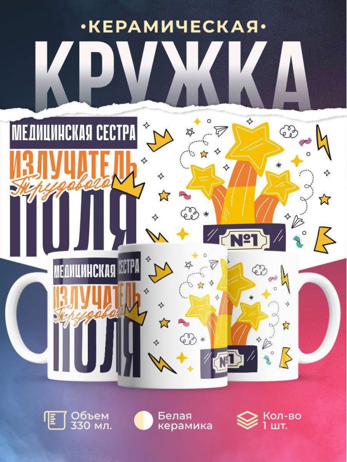 Сувенирная белая кружка с принтом "Медицинская сестра излучатель трудового поля" – отличный подарок родным и близким людям для любого случая. Уникальный дизайн делает ее неповторимой и привлекательной для глаз. Принты могут быть разными: от ярких креативных решений, которые идеально подойдут молодежи, до классических элегантных узоров, радующих взгляд людей любого поколения во время чаепития. Рисунок наносится с использованием специализированного оборудования, материалами, прошедшими испытания на пригодность к использованию в быту.